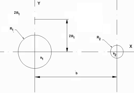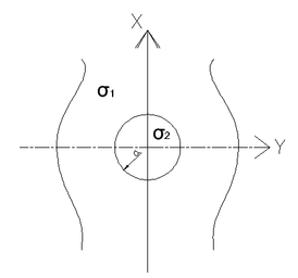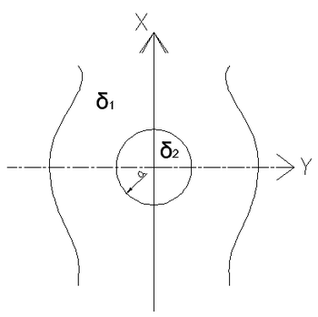 В среде с удельной проводимостью 1 раcположен цилиндр с удельной проводимостью 2. Поле создаётся двумя электродами, форму которых требуется определить. Расстояние между электродами по оси Y (при X=0) должно быть равно 2,5а.