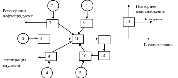 1,2,3,4,5 – сточные воды от характерных технологических процессов.
