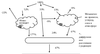 Массовый выброс в атмосферу твердых и жидких частиц резко изменяют рассеивание солнечного излучения в атмосфере, приход теплоты в атмосферу.
