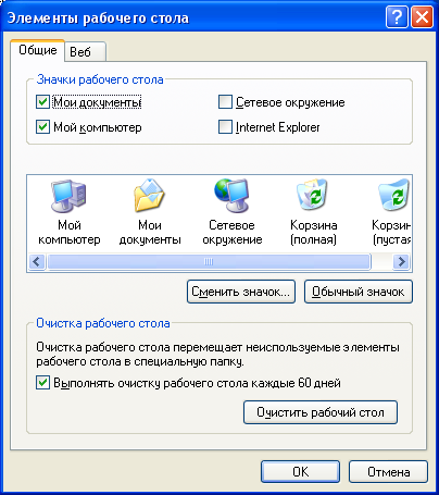 Чтобы добавить или удалить значки «Мои документы», «Мой компьютер», «Мое сетевое окружение» или «Internet Explorer», установите или снимите соответствующие флажки в группе «Значки рабочего стола».