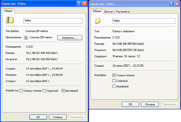 Сравнить архивированную и оригинальную папки, использовав клавишу «Свойства»