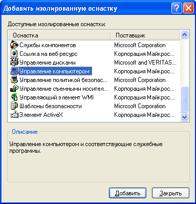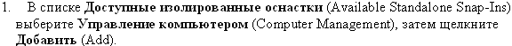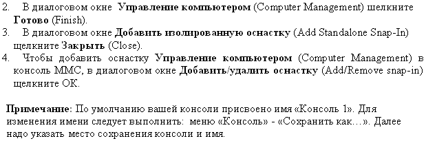 Добавляя оснастки в пустую консоль вы настраиваете ее под свои нужды. Оснастка Управление компьютером (Computer Management) - ещё одно инструментальное средство Windows XP Professional для создания, удаления, изменения и отключения локальных учётных записей и изменения паролей.