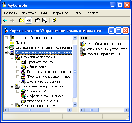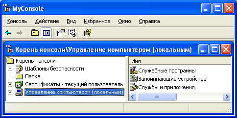 Одно из инструментальных средств управления Windows XP Professional - консоль управления (MMC). Консоль ММС обеспечивает стандартизированный метод создания, сохранения и открытия административных инструментальных средств. Консоль ММС не имеет самостоятельных функций администрирования, но включает, так называемые, оснастки (snap-in), предназначенные для выполнения ряда административных задач.