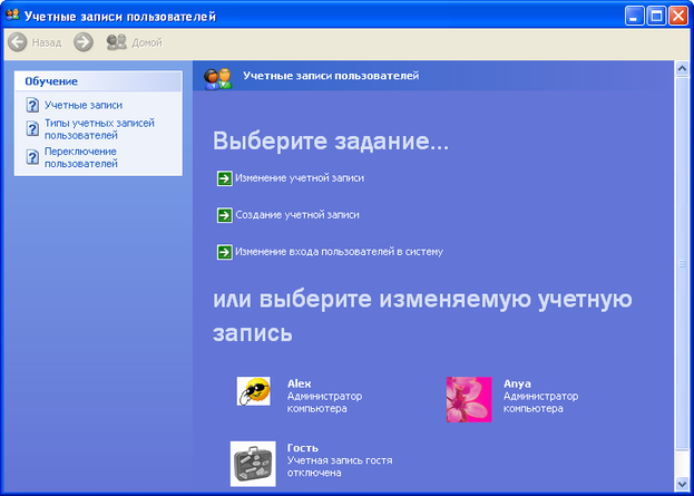 Создавать новые учетные записи пользователей могут только администраторы. Эта команда доступна группе Выберите задание (Pick A Task), только если вы вошли в систему под именем члена группы администраторов.