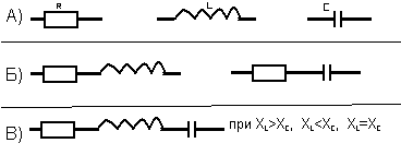 Соотношение сдвигов фаз между током и напряжением при включении различных элементов в