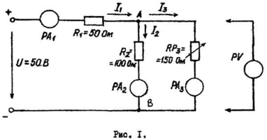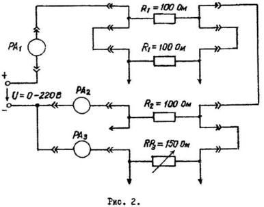 Ручку движка переменного резистора RР3 установить в крайнее левое положение. В качестве амперметров РА1, РА2, РА3 использовать имеющиеся на рабочей панели стенда амперметры с предельными значениями измеряемого тока соответственно 2 А, 1 А, 2 А.