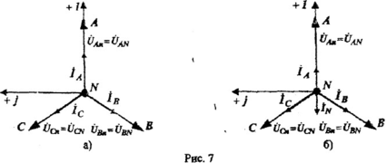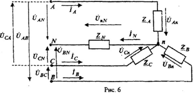 называются линейными проводами. Провод, соединяющий нейтрали источника и потребителя, называют нейтральным (нулевым) проводом. При наличии нейтрального провода, сопротивление которого ZN ≠ ∞, трехфазная цепь будет четырехпроводной. При его отсутствии (ZN=∞) - трехпроводной. Токи ỈA, ỈB, ỈC, текущие по линейным проводам, называют линейными токами; токи, текущие по фазам нагрузки, т.е. в ZA, ZB, ZC - фазными токами. Из рис. 6 видео, что фазные и линейные токи при соединении нагрузки звездой совпадают. Ток ỈN, протекающий по нейтральному проводу, называют нулевым. Натяжение ỦnN между нейтральными точками п, N, по определению равное