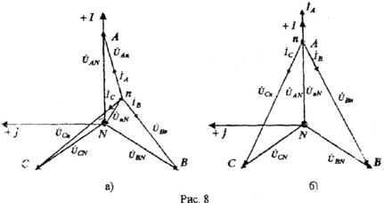 На рис. 8,а,б приведены примеры векторных диаграмм трехпроводной трехфазной цепи:
