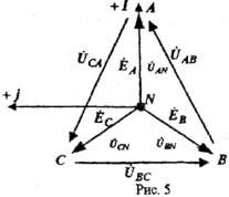 Условно положительные направления э.д.с. идеального симметричного трехфазного источника считают направленными от концов к началу обмоток и показаны на рис. 4. Векторная (топографическая) диаграмма напряжений источника при φN = 0,ψeA = 0 изображена на рис. 5.