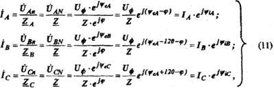 При несимметричной нагрузке согласно формулам (10) фазные (линейные) токи образуют несимметричную систему токов. Ток в нейтральном проводе для этого режима