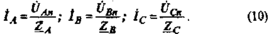 3. Определяются токи в фазах нагрузки (линейные токи) ỈA,ỈB,ỈC. Согласно закону Ома в комплексной форме