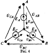 называются фазными напряжениями источника. В выражениях (2): φ(с точкой)A>φ(с точкой)B>φ(с точкой)C - комплексные потенциалы зажимов