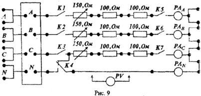 Собрать трехфазную цепь, изображенную на рис. 9, используя приборы