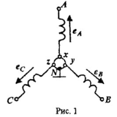 Отдельная цепь трехфазной системы называется фазой. Фазой также называется одна из трех обмоток трехфазного электромашиного генератора. Фазы трехфазного генератора могут быть соединены по схеме «звезда» или «треуголыик», Соединение фаз трехфазного источника по схеме «звезда», при котором концы x.y,z фазных обмоток A-х,В-у,С-z соединяются в общий узел N , показано на рис. 1. Узел N называется нейтралью источника.