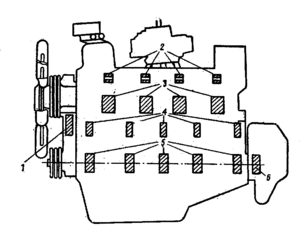 5 – коренных подшипников; 6 – сцепления и маховика.