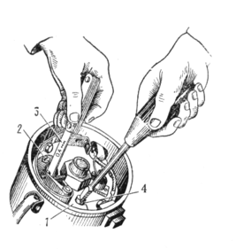1 – стойка неподвижного контакта распределителя; 2 – стопорный винт крепления стойки неподвижного контакта; 3 – щуп пластинчатый; 4 – регулировочный эксцентриковый винт.
