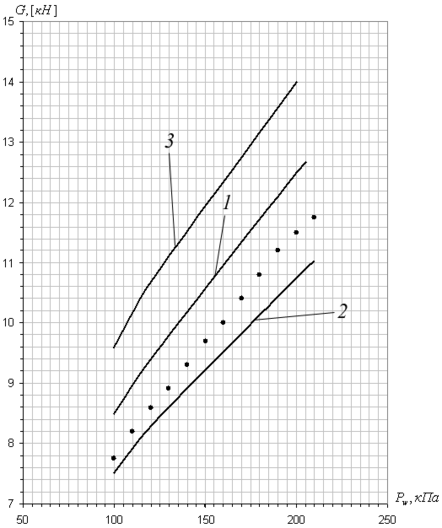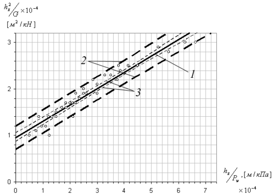 8.3.3 На рис. 5 нанесены поля экспериментальных точек, эмпирической линия регрессии, а также с вероятностью P = 0.90 линии 2, ограничивающие область расположения истинной зависимости ММ (2), и линии 3, ограничивающие область индивидуальных отклонений измеряемой величины