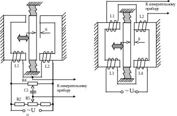 Дифференциальные индуктивные датчики по сравнению с однотактными имеют более высокую точность преобразования, их статическая характеристика близка к линейной. Они содержат два статора с двумя катушками индуктивности L1и L2 и один общий якорь. Катушки индуктивности могут включаться в мостовую измерительную схему, как показано на рис.12 слева или в дифференциальную измерительную схему , как показано на рис. 12 справа.
