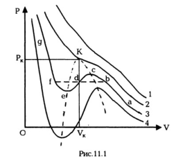 изотерм идеального газа и являются монотонно спадающими кривыми (кривая 1 на рис.11.1; увеличение номера кривых соответствует убыванию температуры). При более же низких температурах изотермы имеют максимум и минимум (кривые 3, 4Г), так что для каждой из них существуют такие интервалы давлений, в которых кривая определяет три различных значения V (три точки пересечения изотермы с горизонтальной прямой).