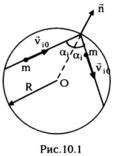 Пусть имеется сферический сосуд радиусом R, в котором содержится N одинаковых молекул идеального газа массой т, движущихся хаотически (см. рис. 10.1). Рассмотрим какую-либо i-ую молекулу, центр масс которой движется со