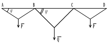 Нерастяжимая нить закреплена своими концами в точках A и D и перекинута через гладкие блоки B и C. По нити могут скользить три тяжелых кольца весом