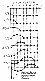 - поперечные, когда частицы среды колеблются перпендикулярно (поперек) лучу волны