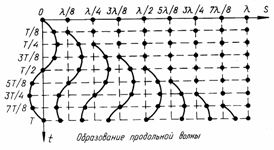 - продольные, когда частицы среды колеблются вдоль луча волны.