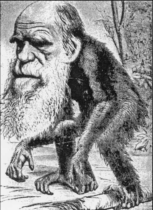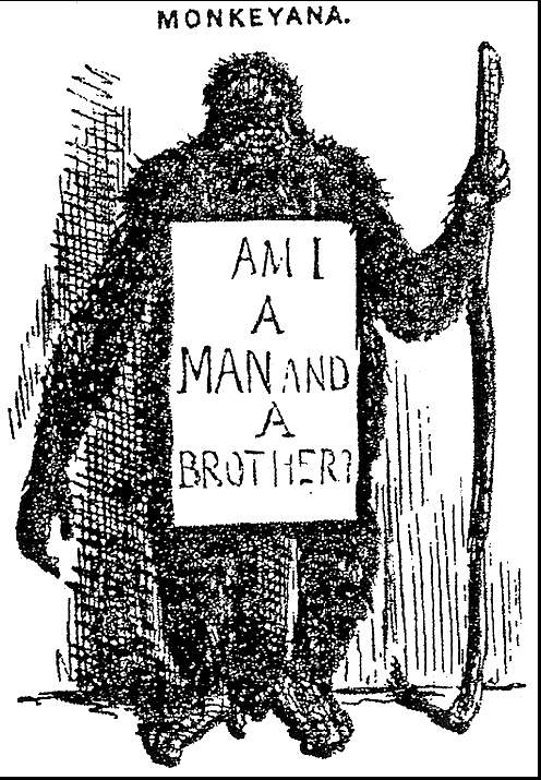 Карикатура на теорию Дарвина (английская газета конца XIX века). На плакате написано «Неужели я человек и собрат?»