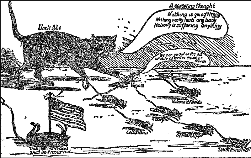 Карикатура того времени: Линкольн‑кот гоняется за разбегающимися мышами штатами