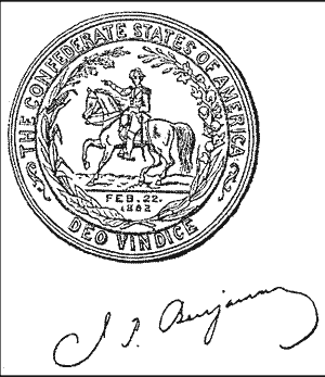 Государственная печать Конфедерации. Д. Вашингтон в обрамлении хлопчатника, табака, кукурузы и пшеницы. Подпись И. Бенджамина – печать изготовлена по его эскизу