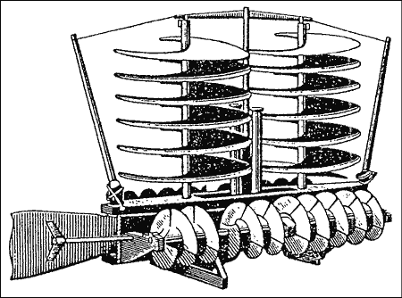 Вертолеты, правда, появились в виде моделей. Генерал армии северян Миттчелл, в гражданской жизни профессор, испытал даже модель геликоптера с винтом метрового диаметра. Южанин, инженер из Алабамы Поуэрс, предложил довольно экзотический проект «винтокрыла», с которым читатель может познакомиться по рисунку. Передвигаться это чудо должно было при помощи паровой машины (только лет через тридцать знаменитый американский изобретатель Эдисон окончательно и неопровержимо докажет: паровая машина для летательного аппарата непригодна). Поуэрс даже построил макет своего аппарата. Южане его тут же засекретили так, что макет обнаружили по чистой случайности в каких‑то запасниках лишь в 1940 г. (195).