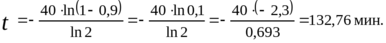 Пример 1. Определите время, за которое прореагирует 90 % вещества А, разлагающегося по реакции первого порядка: A ® B + D, если известно, что время полупревращения составляет t ½ = 40 мин.
