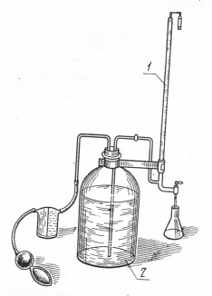 1-предохранительная трубка с кристаллами сернокислого железа, 2-склянка Тищенко со щелочным раствором пирогаллола