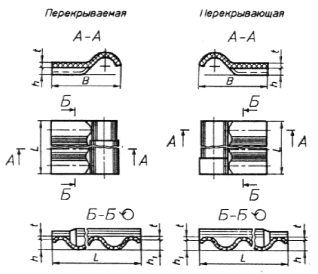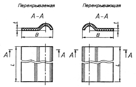 | Сокращенное обозначение детали | Длина L ±10 | Ширина В ±10 | Толщина t + 1,0 - 0,3 | Высота рядовой волны h ±3 | Высота пере- крывающей волны h(1) ±3 |