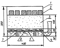 Капиллярное водонасыщение проводят через слой воды (см. рисунок 1), постоянно поддерживаемый с помощью уровнемера. В сосуд на металлическую подставку укладывают металлическую сетку или устанавливают емкость с сетчатым дном, которое закрывают фильтровальной бумагой. На фильтровальную бумагу насыпают слой мелкого песка одной фракции толщиной 15 см и через сутки после его насыщения ставят образцы, которые насыщают в течение 3 сут. Для предотвращения высыхания сосуд с образцами помещают в ванну с гидравлическим затвором.