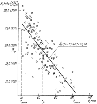 в указанном диапазоне времени распространения ультразвука допускается. Результаты установления градуировочной зависимости представлены на черт. 3. Если в испытаниях р-го образца получено значение tp = 82,7 мкс, то прочность этого образца, определенная по градуировочной зависимости, составит