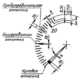 Расположение чисел отсчета относительно оцифрованных отметок устанавливается в рабочих чертежах на прибор конкретного типа.