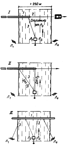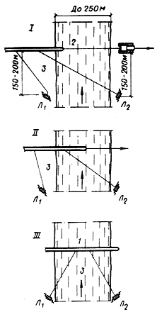 | Рис. 9. Схема установки трубопровода в створ при ширине реки до 250 м | Рис. 10. Схема установки трубопровода в створ при ширине реки более 250 м |