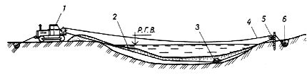 1 - Скреперная тракторная лебедка; 2 - рабочий трос; 3 - скреперный ковш;