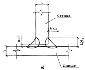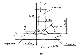 Для резервуаров с толщиной листов нижнего пояса стенки 20 мм и менее рекомендуется тавровое сварное соединение без разделки кромок (рисунок 3.6,а.). Размер катета каждого углового шва должен быть не более 12 мм и не менее номинальной толщины окрайки.