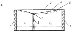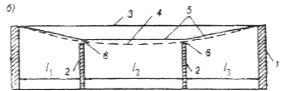 а — одной в пролете; б — двух в пролете; 1 — несущие стены (или колонны); 2 — капитальные перегородки; 3 — перекрытие (покрытие) до приложения нагрузки; 4 — перекрытие (покрытие) после приложения нагрузки; 5 — линии отсчета прогибов; 6 — забор