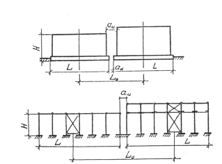 где L0 — расстояние между центрами смежных отсеков бескаркасных зданий (сооружений) и каркасных зданий с фундаментами, соединенными связями-распорками или иными конструктивными решениями фундаментов в направлении, перпендикулярном деформационному шву, или расстояние между центрами блоков жесткости каркасных зданий с несвязанными фундаментами (черт. 3);