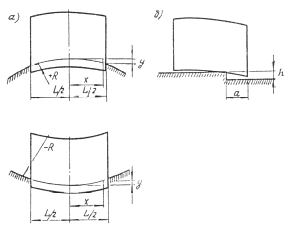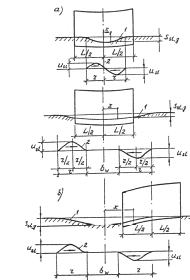 Черт. 1. Схемы вертикальных перемещении темной поверхности при подработке, вызванных кривизной (в) или образованием уступа (б)