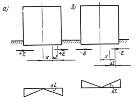 8. Схема горизонтальных перемещений земной поверхности принимается в виде линейных треугольных эпюр с нулевой точкой, расположенной в центре здания (сооружения) . Перемещение любой точки основания Dl относительно соответствующей центральной оси здания (сооружения) или его отсека (черт. 2 настоящего приложения), вызванное горизонтальными деформациями (растяжением-сжатием) . следует определять по формуле