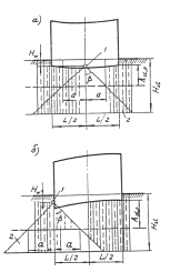 а — замачивание основания под серединой здания (сооружения) ; б — то же, под торцом; 1 — источник замачивания; 2 — область растекания воды; а - длина участка неравномерной просадки; b — угол растекания воды; Нw,— глубина расположения источника замачивания; hsl,p - зона просадки основания от внешней нагрузки; Нsl— просадочная толща