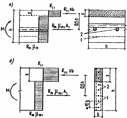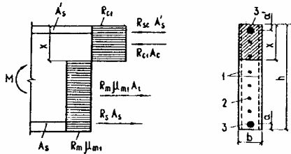 Черт.4. Схема усилий и эпюра напряжений в изгибаемых элементах прямоугольного сечения с сосредоточенной стержневой и проволочной арматурой