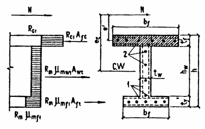 Черт. 11. Схема усилий и эпюра напряжений во внецентренно сжатых элементах двутаврового сечения при х > t¢f