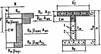 3.16. Расчет внецентренно сжатых элементов таврового и двутаврового сечений с арматурой, приведенной к равномерно распределенной (см. п. 3.2), следует производить: