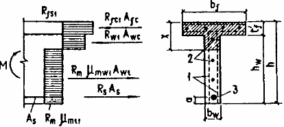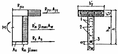 3.10. Расчет тавровых сечений с полкой в сжатой зоне или приведенных к тавровым сечениям, в которых наряду с арматурой, приведенной к равномерно распределенной (см. п. 3.2), имеется стержневая или проволочная арматура в растянутой зоне, при x = x/h £ xR следует выполнять в зависимости от высоты сжатой зоны бетона: