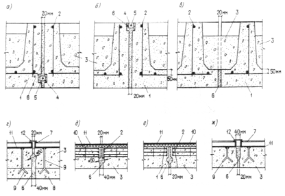 в — стык ребристых панелей с консольными выступами; г — стык двухслойных панелей; д — стык панелей с окаймляющим арматурным каркасом; е — стык панелей с окаймляющим каркасом из тяжелого жаростойкого бетона; ж — стык панелей из легкого жаростойкого бетона; 1 — тяжелый жаростойкий бетон; 2 — арматурный каркас;